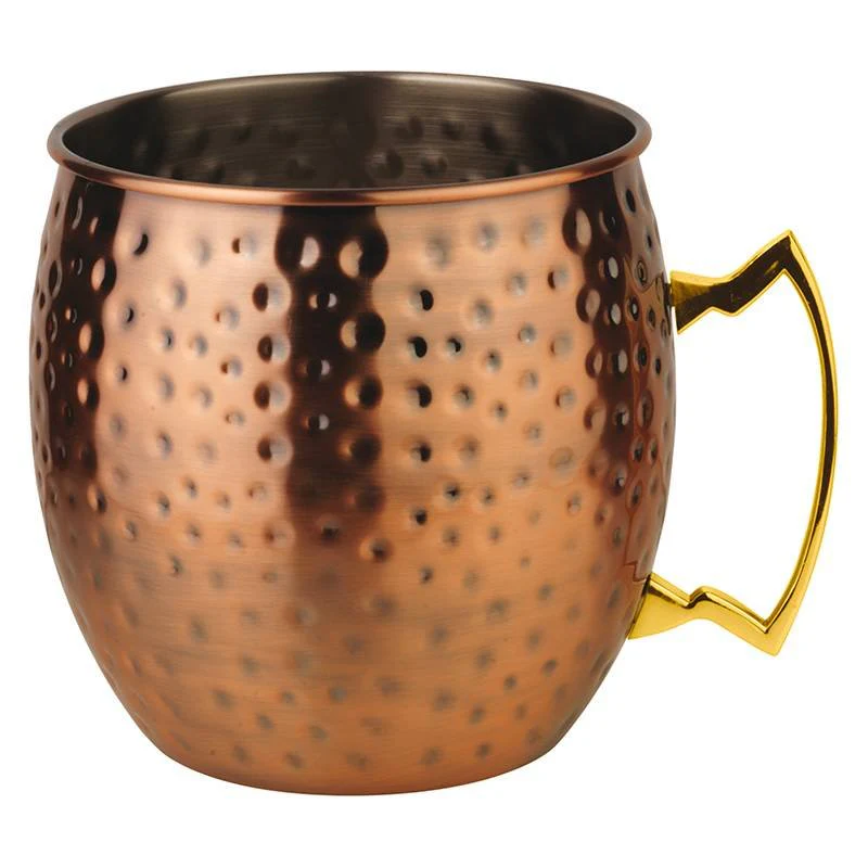 Tazza per cocktail Moscow Mule in acciaio inox con rivestimento in rame anticato e manico dorato. La sua capacità di 3 litri la rende ideale per feste e serate in compagnia, permettendo di preparare e servire generose quantità di cocktail. Realizzata in acciaio inox con finitura PVD, è idonea per alimenti e facile da pulire, garantendo resistenza all’uso frequente. Questo accessorio, perfetto per bar e locali, mantiene il cocktail fresco e freddo a lungo, offrendo un’elegante alternativa alle tradizionali tazze in vetro o ceramica.